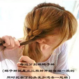 蝎子辫的方向,是从发顶斜着向下的,发尾没有头发添的时候,编麻花辫发型,用小皮筋将辫子固定。