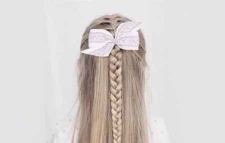 在公主头的基础上额外留出一缕长发,扎成比较松弛的麻花辫,适合需要穿蓬蓬裙或者复古公主裙表演的舞台,十分适合头发比较长的宝宝,如果太单调的话,可以选择白色,浅紫色等淡雅饱和度较低色系的头花,或者给宝宝戴上一个花环,就顿时能够化身舞台**的小精灵了。