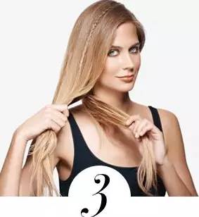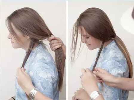 STEP2:将这一股头发编成细长的三股辫直到发尾,用橡皮筋固定。