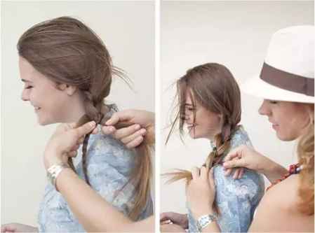 Step3:将随意扎好的马尾解开,并平均分成两部分,将编好的麻花辫搁置中间。