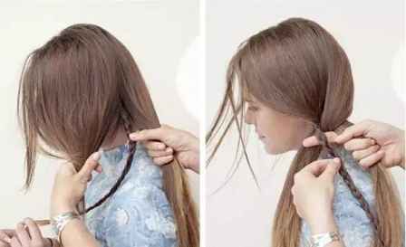 STEP4:从两股头发的外缘各取出一小束头发在中间交叉,然后和这两股头发再次合并。