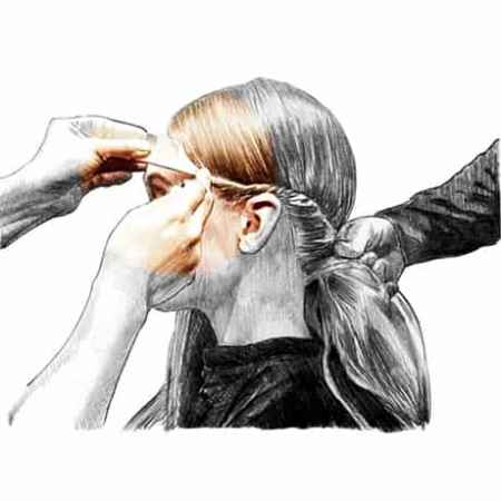 STEP 1:这款新娘发型整体光洁靓丽,首先需要给头发打上一层发胶,让所有头发更光滑有粘附性。梳顺所有头发后,从左边开始如图所示,将头发向内卷,并且一小股一小股地往里面加头发,一直到后脑勺。