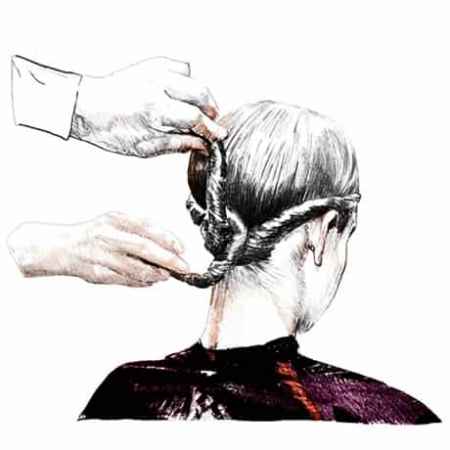 STEP 2:右边采用同样的方式,将头发内卷至后脑勺,两股头发先分别向一个方向旋转,然后再缠在一起,也就是所谓的草绳编发。