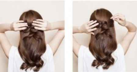 step1:首先我们从耳际处往后取两束头发出来,分别的把发束对折,扭转成蝴蝶结的形状。