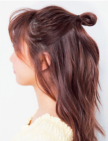 齐刘海向前,可以用卷发棒稍微夹一下,营造内扣感觉,然后将后面的头发分成两部分,上面的部分用橡皮筋对折扎起来。