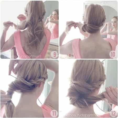 步骤10:、然后将所有的发丝拢在一侧,向一侧内卷,如图示。