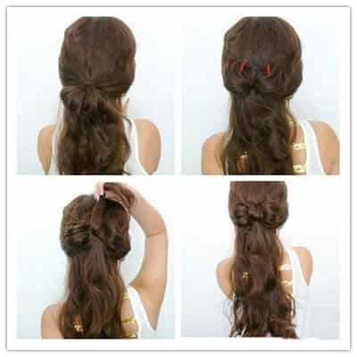 Step:首先把两侧的头发抓起来,后脑勺的地方不需要管,然后用橡皮筋扎起来,从中间均匀分开,用小夹子固定,然后在冲中间抓一撮头发,往上绕,再从皮筋和后脑勺的空隙中拉下来就可以了,一款甜美减龄娇俏的蝴蝶结编发就完成拉。