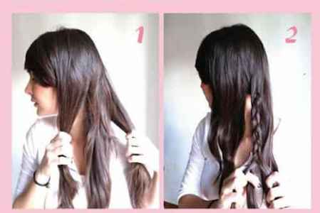 Step1:首先将头发整理一遍,不打结才会更好操作接下来的步骤。将头发全部集中在左侧肩膀,均匀的分成三股,从中间这股头发开始编单个辫子。