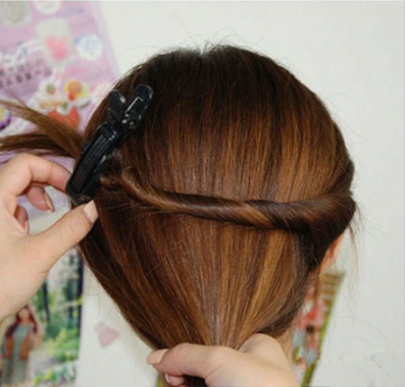 第四步:取掉暂时固定的大发夹,然后将两只扭转好发辫在右边进行相互扭转。