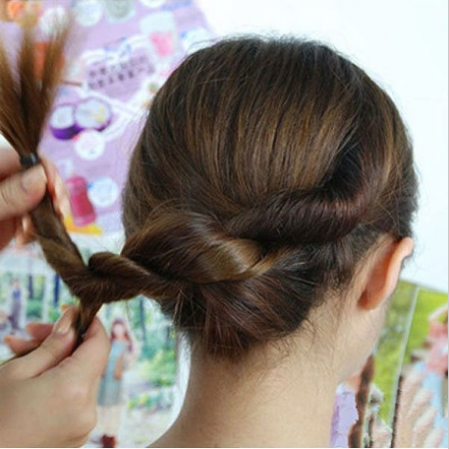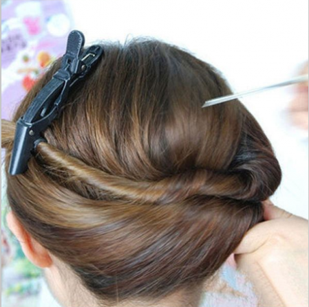 第七步:使用多个黑色小发夹将发尾固定住,这样就可以完成简约韩式盘发啦。