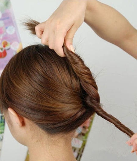第三步:将剩下的头发如图往右边进行反方向扭转,发尾用橡皮筋固定好。