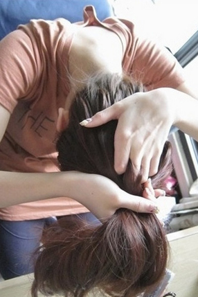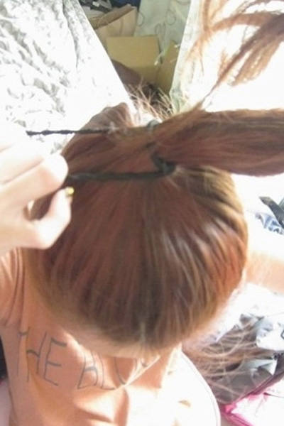 第一步:先用梳子将头发梳理好,然后低下头,用手将全部头发集中到头顶的位置。