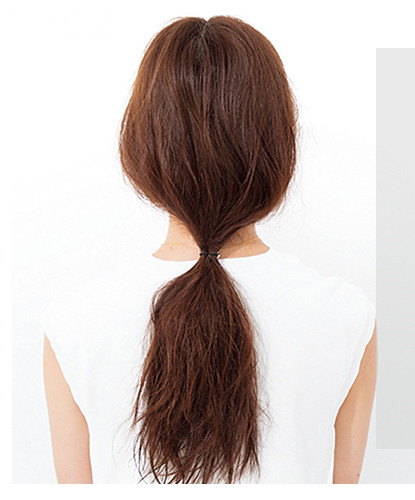第一步:首先把头发往后拢起来,扎在比较低的位置,不要扎得太紧,将发圈往下拉扯一下。