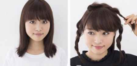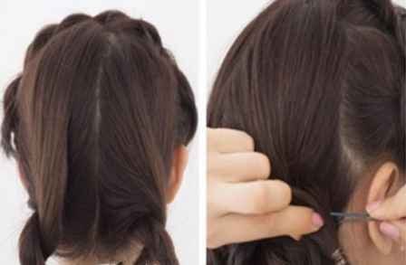 步骤三:接着将编织好的二股辫拉扯都头顶处,进行交叉固定。