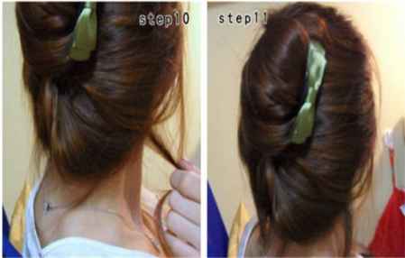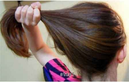 然后把半马尾扭转几圈扎成**形状,并用黑色小发夹固定好。
