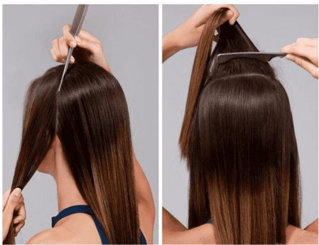 以左右两侧耳后为分界线,再用尖尾梳划分出两束头发。