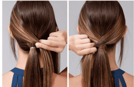 取出左侧边的发束,并将发束覆盖到马尾上面。