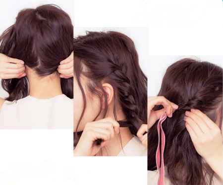 在右侧扭转编发过程中加入准备好的一根发带。(注意,将发带对折用黑色橡皮筋固定在U型发夹上,然后再固定到头发里。)