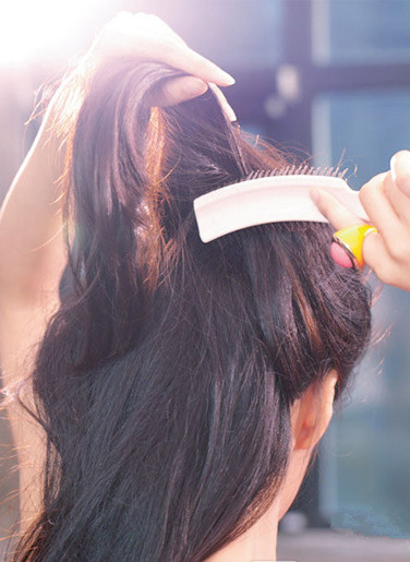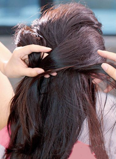 第三步:打毛好后用橡皮筋将头发扎成马尾。