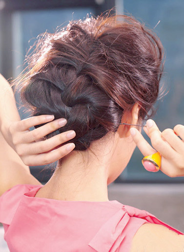 第五步:一直往下进行编发,在编发的过程中不对加入新的发束,编织到发尾,然后将发尾盘起来,并用黑色小发夹,这样就可以这种蓬松盘发了。