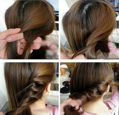 步骤二:接着把这二束头发扭转起来,交叉慢慢往下面卷起。