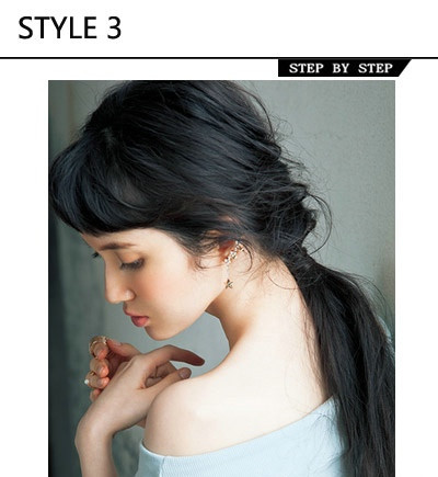 头发少的MM会觉得将头发盘起之后显得头发更少,其实可以抽出一些发丝让头发显丰盈一些。