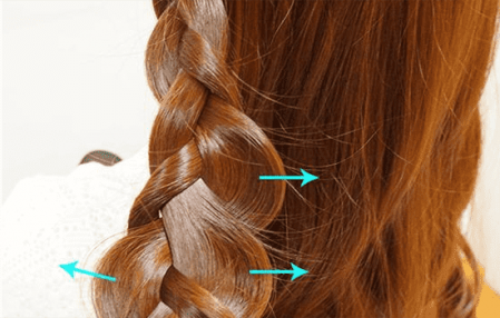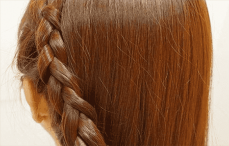 step2:将这一束头发往后编成三股麻花辫倒头发4/5的地方用发绳固定住。