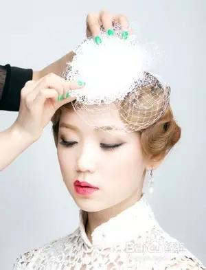 步骤五:选择网眼纱搭配蕾丝饰品佩戴在前区分缝处,进行点缀 ,使造型更加饱满,有型。