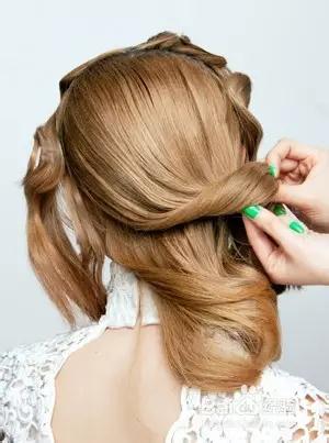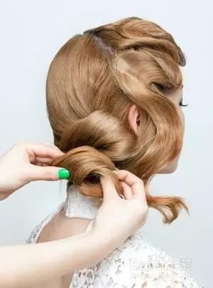 步骤二:把后区剩于头发再次利用手打卷,固定在一侧,一定要注意整个发鬓的饱满和圆润。