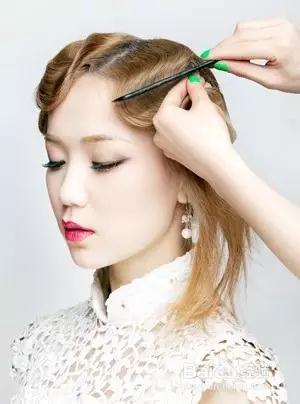 步骤三:把前区头发三七分,把一侧分出较薄的一片发片,用食指和中指夹住发片,右手持梳穿透发片,和左手配合贴着头皮推挤出S波纹型,然后用鸭嘴夹固定,做出波纹。