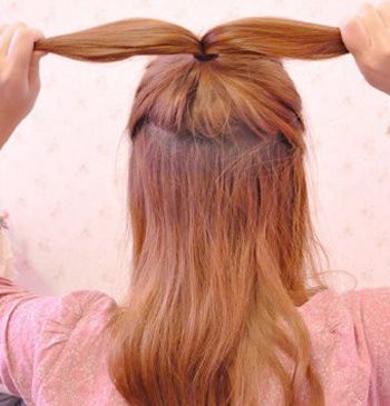 第一步:先用梳子将长发梳理通顺,然后以耳朵为分界线,将头发划分为上下两部分,并将上部分的头发用橡皮筋扎成高马尾,接着用双手将马尾往两侧拉,使得马尾紧一点。