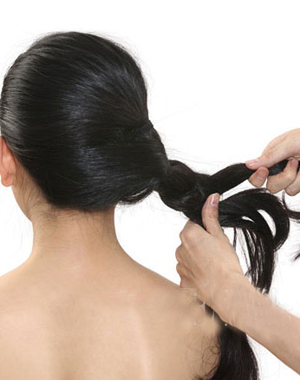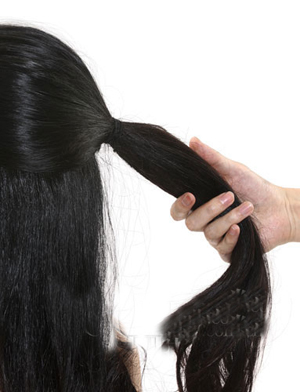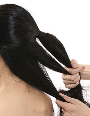步骤2:将剩下的头发捋顺后左右分成均等的两部分,一手抓一边,右手同时还要抓住顶部的马尾,形成小时候我们编三股麻花的架式。
