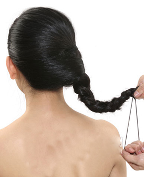 步骤5:全部编完后将尾端扎紧,调整整个麻花的松紧度,做到自然有软度,可以随意在垂于身后或搭在肩上。