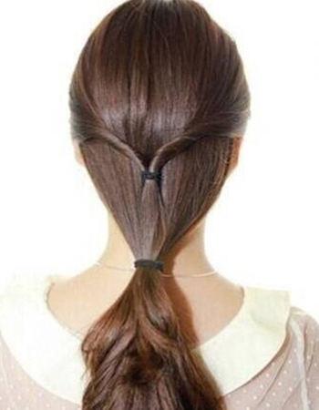 在扎好的头发两个皮筋之间选一个中点,从发尾开始把头发塞进这个中点里面去。