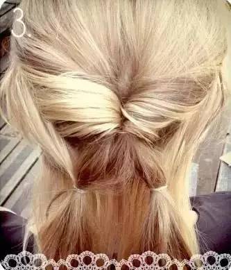 Step 3:将第二层的头发分为左右两部分,翻转后的发束也分为相同的两部分,分别和下层的头发绑在一起。