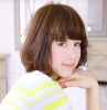 短发波波头发型,浅亚麻色染发很衬肤色,将MM的肌肤更加白皙透亮。自然内扣的卷度刚刚好包裹住脸型,修饰脸部线条,侧分刘海把一半的脸遮住,从而有着巧妙的打造出瘦脸的效果,秒变巴掌小V脸。