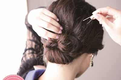 Step3:最后将固定好的马尾扭转成花朵状,盘起后用黑色小发夹固定。花朵发髻就搞定了。