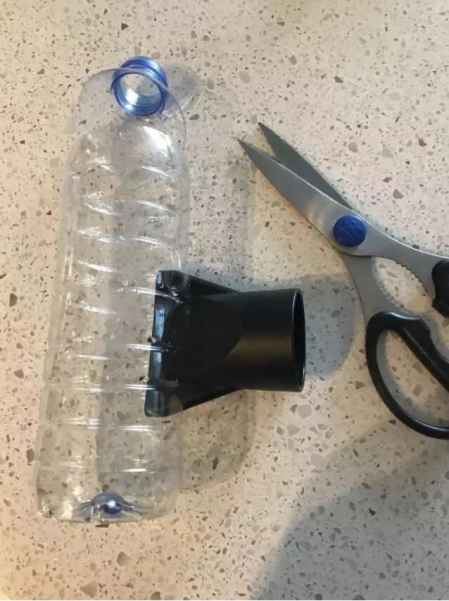 先在瓶子侧面划一个口子,放置扁嘴吹风机。