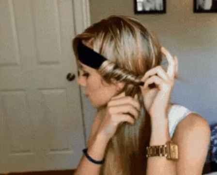首先找一个发带,戴在头上,要把头发压住。先取一小撮头发,绕着发带缠一圈。