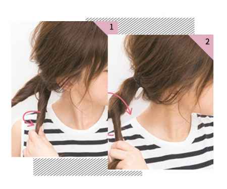 第二步:将扭转的两支发束交叉在一起,再进行扭转成一支发束。