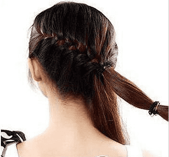 第四步:紧接第二步,把扎好的马尾分为两半,再用橡皮筋在其中一束头发的中间扎上橡皮筋。
