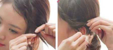 STEP3:将刘海分区并且向前用三股辫的方法编织刘海,并且用夹子固定在耳后。