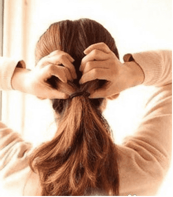 第二步:然后用橡皮筋将全部头发成一束中高度的马尾辫。