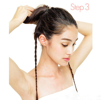 第三步:用双手将头发从发尾开始往上卷,卷成条状。