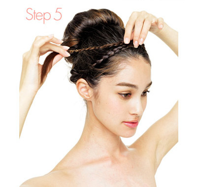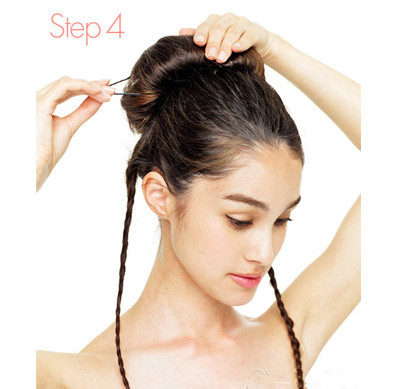 第五步:再将两条辫子围绕盘发固定,并带上准备的发簪,这样就完成这款很有气质型的盘发发型了。