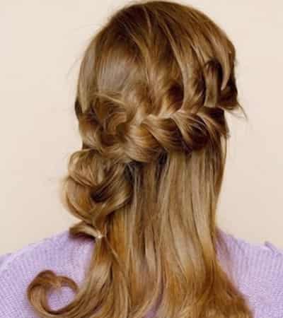 将上方区域内的头发由右耳处开始,向左耳的方向分成三股,开始辫辫子,编完后使用皮筋固定发尾