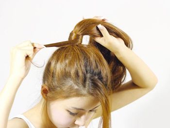 第六步:把准备好的大蝴蝶结发饰戴在马尾辫上,如图。最后,整体打理一下就可以完成这款甜美气质的韩式高马尾了。