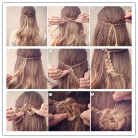步骤13-15:将节点以下的两条辫子松散开来,重新编织一条较粗的三股辫。然后轻轻的拉松散,在发尾处固定辫子。