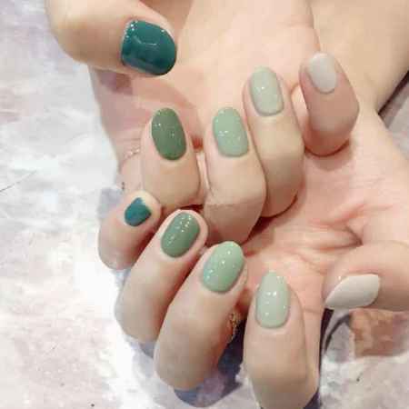 深浅绿色依次跳色这款美甲还蛮有意思的呢,既清新养眼又有撞色之美,重点是这种颜色美甲显手白。