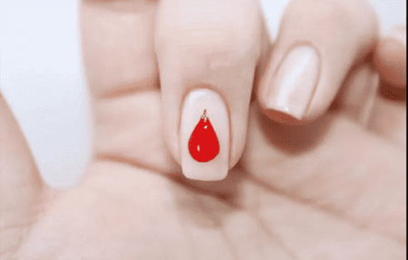 第二步:用勾线笔蘸取红色甲油在中指中间画出水滴图案,照灯60秒。